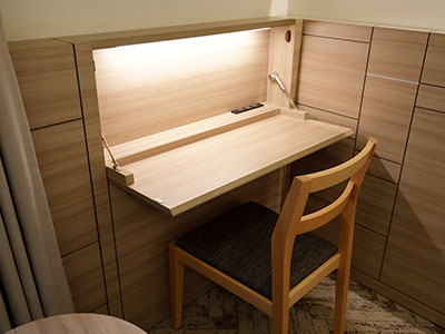 Feel free to do some work at this desk with a light and outlet. (Not available in some rooms)