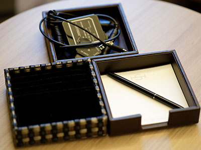 The small, three-tiered box contains a notepad, pen, and smartphone charger.
