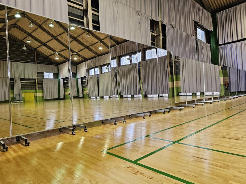 このたび、体育館に設置しておりますトレーニングミラーを増やし、計18枚となりました。